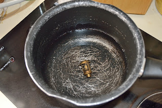 I took the thermostat up to the galley, got the nastiest pot we own, dropped it in the water, and turned the burner to its highest setting.